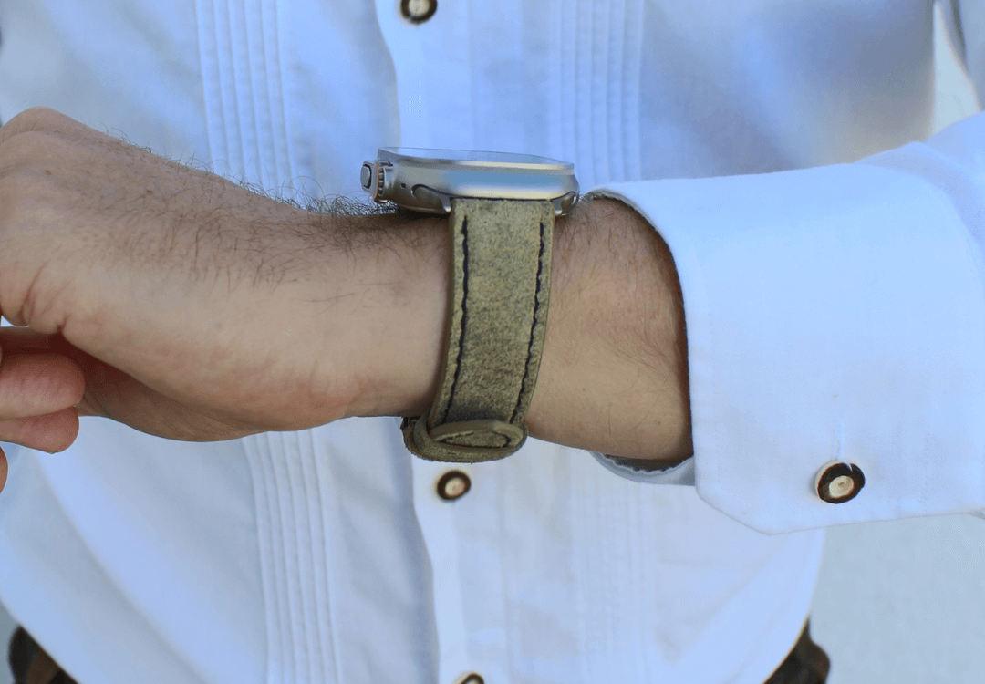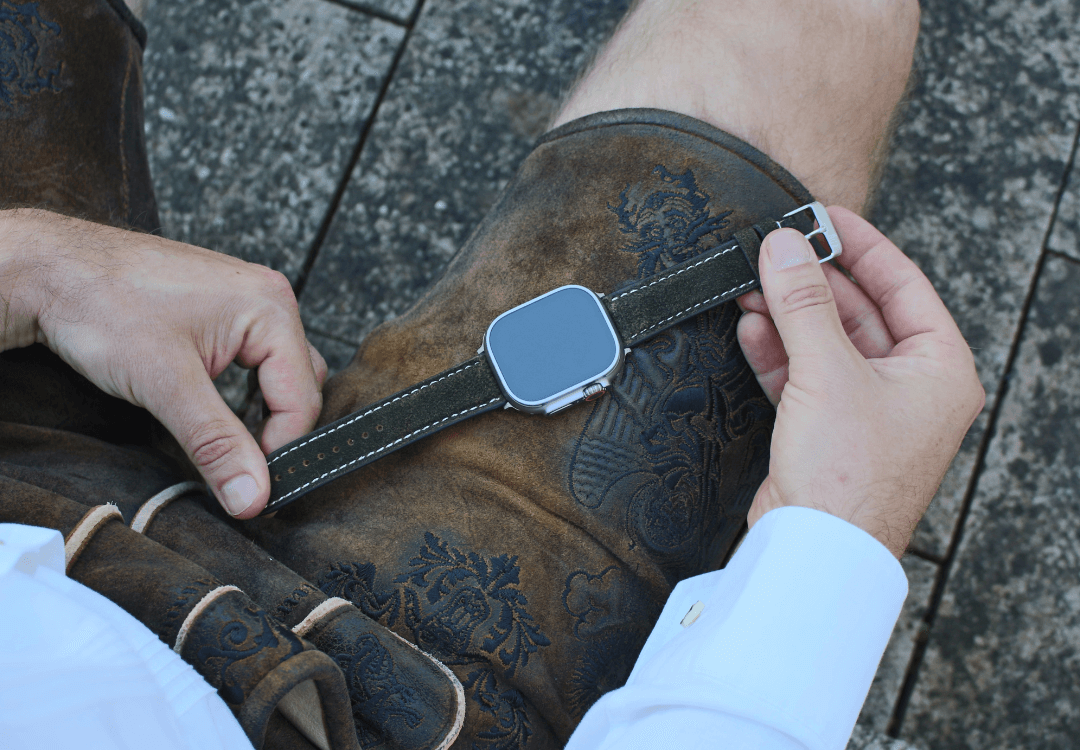 Dank des samtig weichen Lederhosenleders ist es super angenehm zu tragen, lässt dich darunter nicht schwitzen und es passt sich deinem Handgelenk perfekt an. Das Armband wertet deine Apple Watch auf und lässt dich damit garantiert gut aussehen. Es ist die perfekte Ergänzung zu jeder Lederhose.