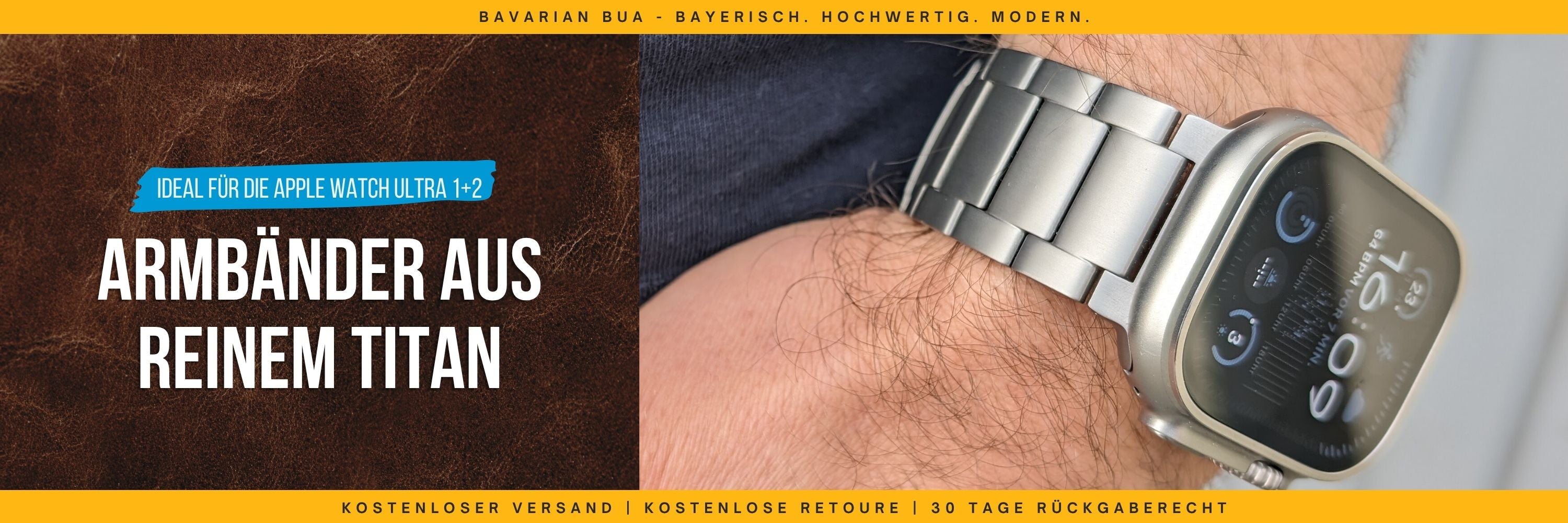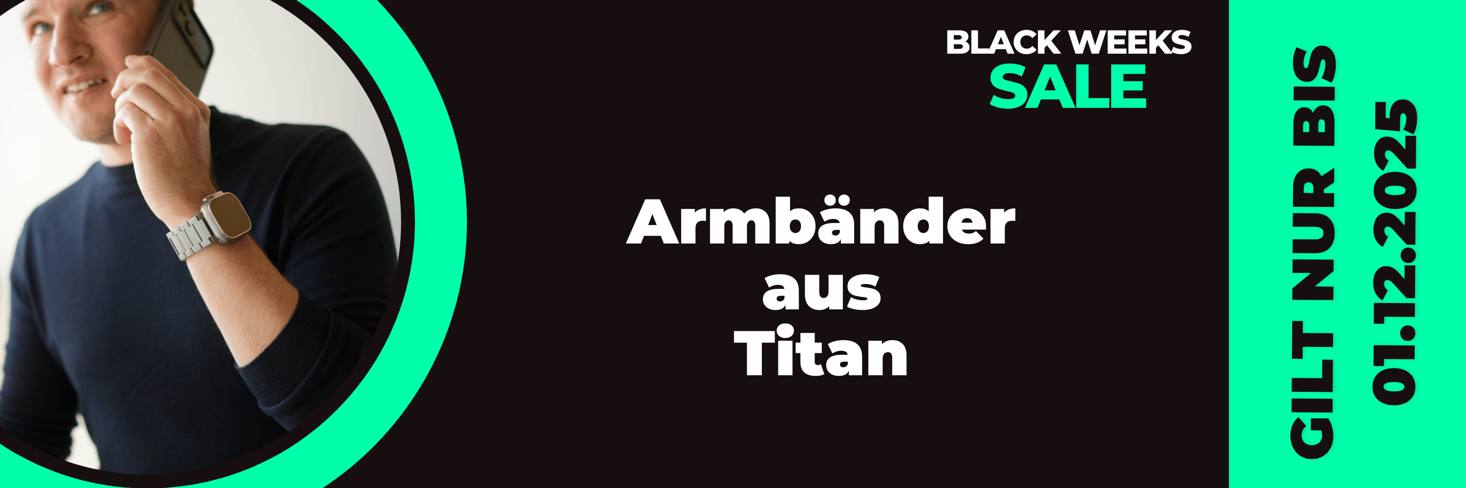 Stylisches und strapazierfähige Titan Armbänder für deine Apple Watch aus Titan Grade 2. Unsere Bänder sind mit 26 mm besonders Breit. Die Armbänder sind ultra leicht und passen ideal zur Apple Watch Ultra 1-3. Dank der aufwändigen DLC-Beschichtung ist es Armband langlebig und besonders robust.
