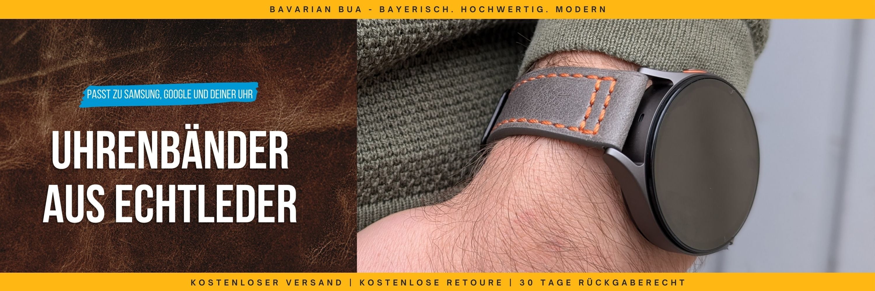 Die Lederarmbänder für Armbanduhren oder deine Samsung Galaxy Watch werden von Hand in kleinen Manufakturen in Bayern hergestellt und mit einem blauen und einem weißen Faden "bavarisiert". Jedes Produkt ist ein absolutes Unikat und wird in annähernd 60 Arbeitsschritten zu einem kleinen Meisterwerk.