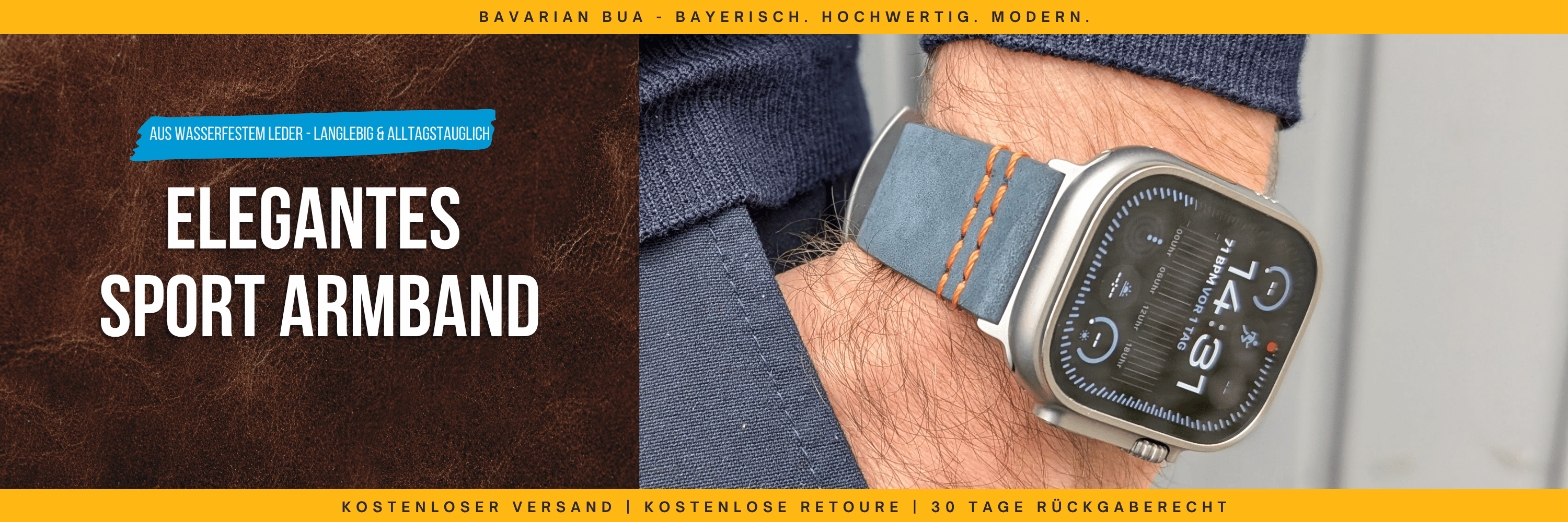 Entdecke unser robustes Sportarmband aus schadstoffgeprüftem, wasserabweisendem Leder aus Italien. Handgefertigt in Bayern und ausgestattet mit passgenauen Edelstahladaptern – ideal für deine Apple Watch Ultra 1, 2 und 3 in Natur und Schwarz. Perfekt für Sport, Alltag und Büro.