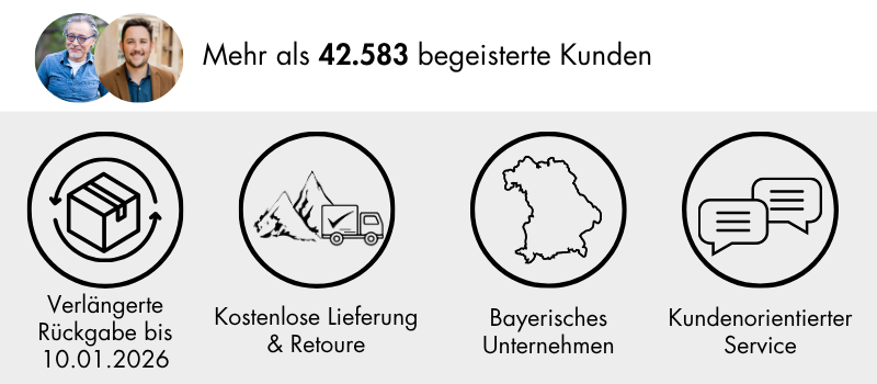 Wir gewähren dir neben dem gesetzlichen Widerrufsrecht (Informationen zum Widerruf und die Widerrufsbelehrung findest du hier) ein freiwilliges Rückgaberecht von insgesamt 30 Tagen nach Warenerhalt.