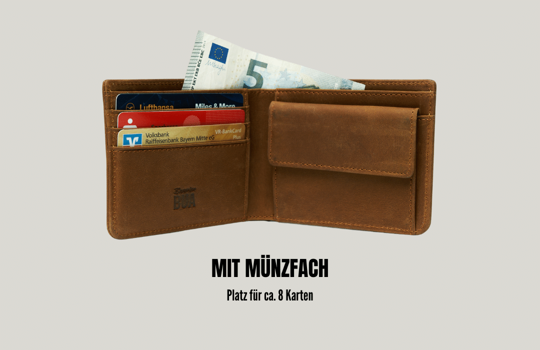 Der "Gäidbeidl" ist für jeden Anlass perfekt geeignet, da er Platz für bis zu 8 Karten bietet, ein abgetrenntes Scheinfach hat und ein kleines Münzfach. Egal ob auf dem Volksfest oder dem Businesstrip, dein Gäidbeidl passt immer.
