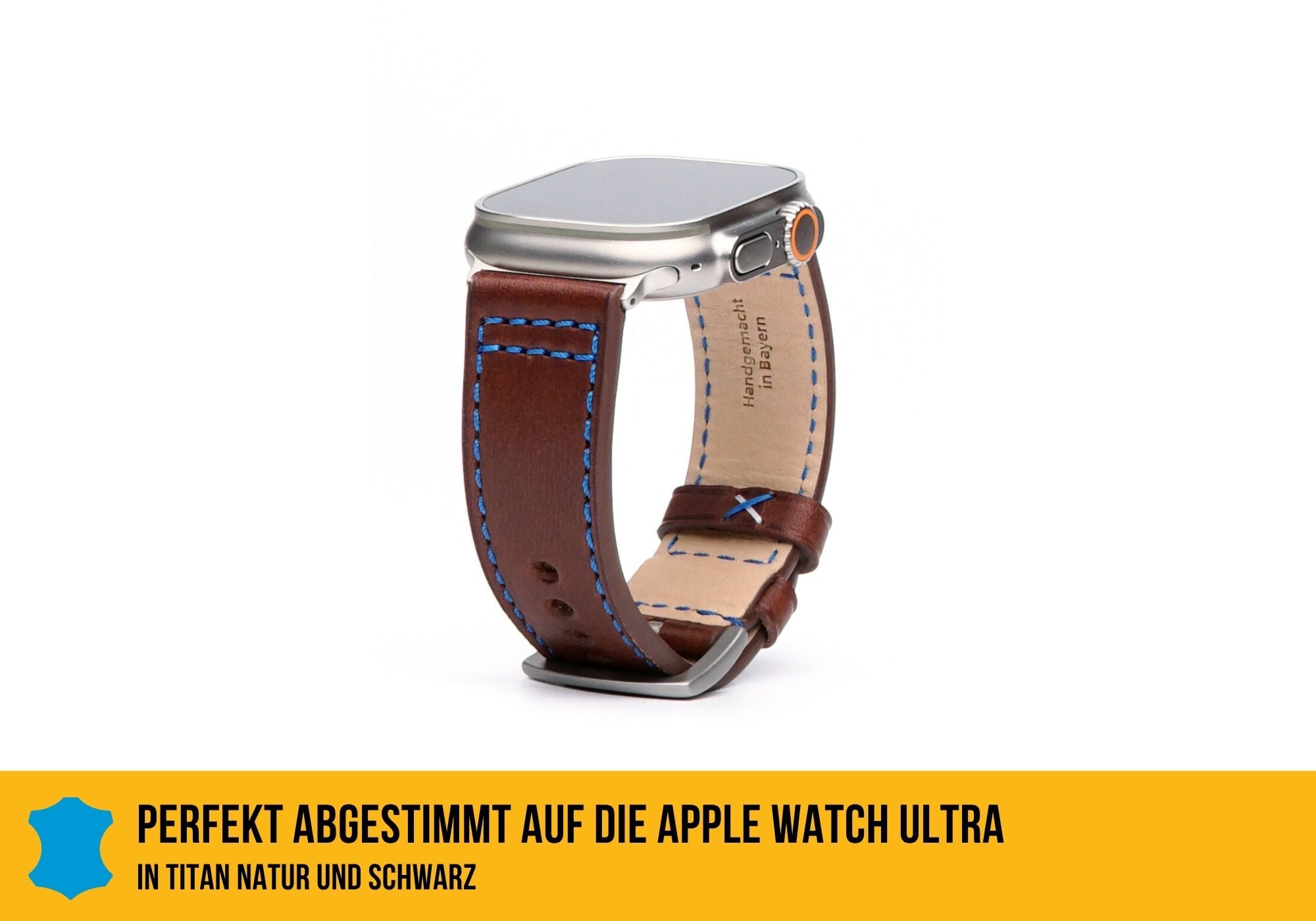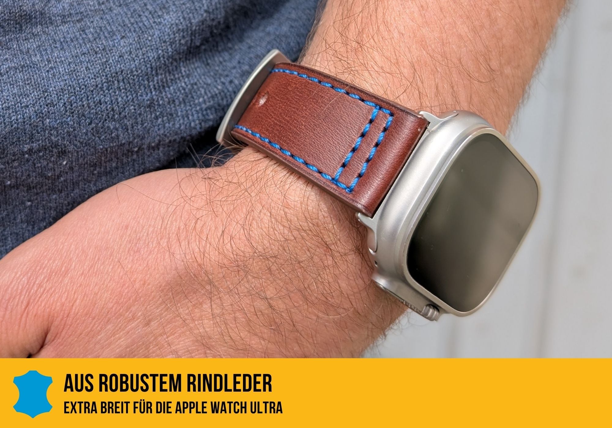 Braunes Echtleder, fein verarbeitet, blaue Kontrastnähte und extra breit. Perfekt für deine Apple Watch Ultra.